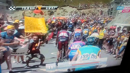 O espetador surgiu na 16.ª etapa, numa das subidas mas difíceis da Volta à França, em Col du Tourmalet, com um cartaz no qual se pode ler "Vai estudar Relvas" junto a várias bandeiras portuguesas.
