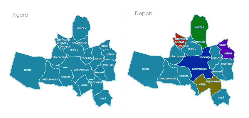 As 19 de Cantanhede devem dar lugar a 14 mediante agregação da da sede do Município com a de Pocariça e a fusão das de Covões e Camarneira; Vilamar e Corticeiro de Cima; Sepins e Bolho; Portunhos e Outil.